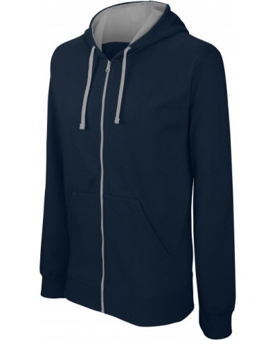 80% gekämmte Baumwolle / 20% Polyester. Gebürstetes Fleece. Kopfhörer-Kabelführung in der Kängurutasche und am Kragen. Strickbündchen an Ärmeln und Saum. Gefütterte Kapuze in Kontrastfarbe mit Kordelzug. YKK®-Reißverschluß in Kontrastfarbe