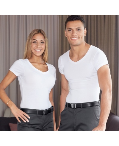 Short-sleeved T-shirt with V-neck. Cotton washed with enzymes means the upper surface is pleasantly smooth and soft.