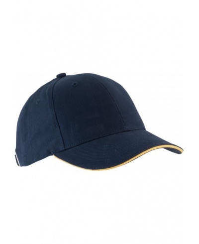 100 % heavy brushed cotton Twill. Contrast sandwich peak. Size adjuster with metal buckle and grommet.