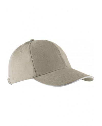 100 % heavy brushed cotton Twill. Contrast sandwich peak. Size adjuster with metal buckle and grommet.