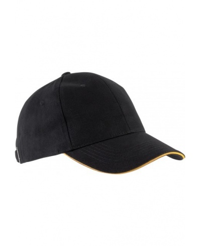 100 % heavy brushed cotton Twill. Contrast sandwich peak. Size adjuster with metal buckle and grommet.