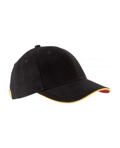 100 % heavy brushed cotton Twill. Contrast sandwich peak. Size adjuster with metal buckle and grommet.