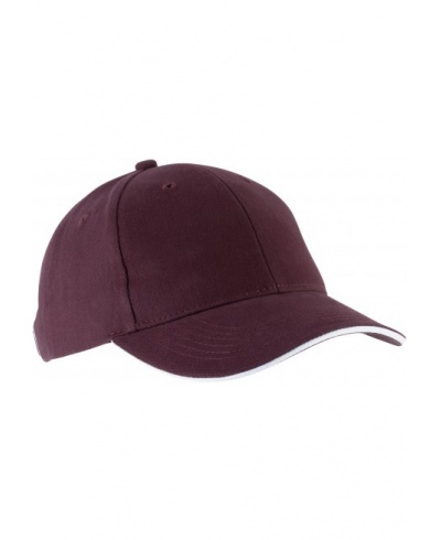 100 % heavy brushed cotton Twill. Contrast sandwich peak. Size adjuster with metal buckle and grommet.