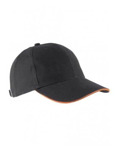 100 % heavy brushed cotton Twill. Contrast sandwich peak. Size adjuster with metal buckle and grommet.