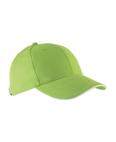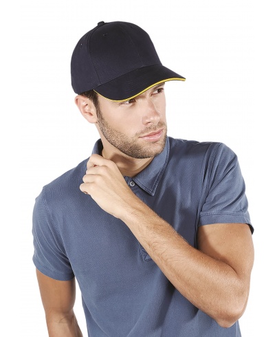 100 % heavy brushed cotton Twill. Contrast sandwich peak. Size adjuster with metal buckle and grommet.