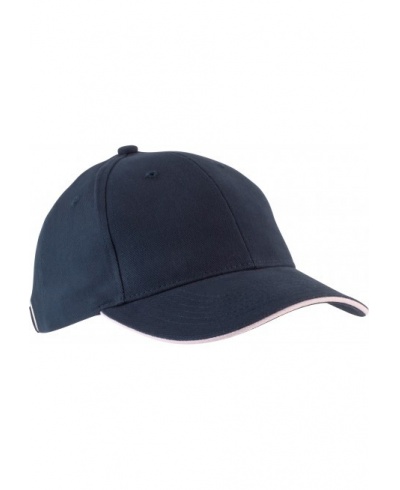 100 % heavy brushed cotton Twill. Contrast sandwich peak. Size adjuster with metal buckle and grommet.