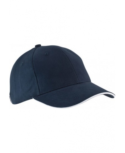 100 % heavy brushed cotton Twill. Contrast sandwich peak. Size adjuster with metal buckle and grommet.