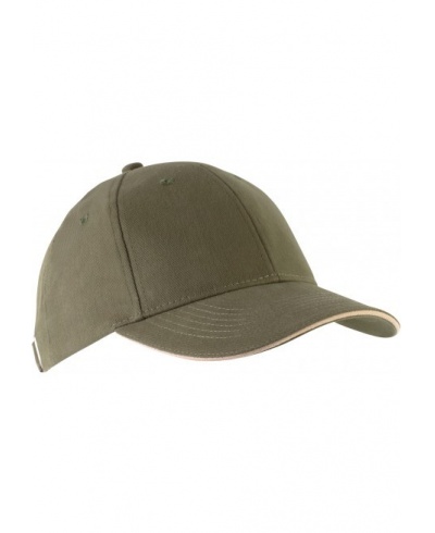 100 % heavy brushed cotton Twill. Contrast sandwich peak. Size adjuster with metal buckle and grommet.