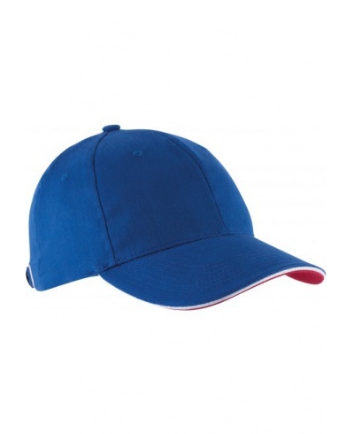 100 % heavy brushed cotton Twill. Contrast sandwich peak. Size adjuster with metal buckle and grommet.