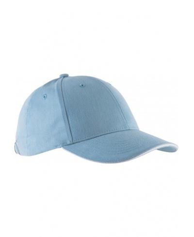 100 % heavy brushed cotton Twill. Contrast sandwich peak. Size adjuster with metal buckle and grommet.