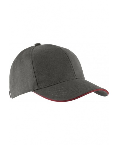 100 % heavy brushed cotton Twill. Contrast sandwich peak. Size adjuster with metal buckle and grommet.