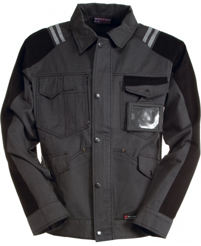 All-season jacket with contrasting two-tone inserts and stitching , jeans-type fitted model with front fastening, zip and covering flap with buttons, adjustable cuffs and waist with button, two kangaroo pockets with LOCK SYSTEM flap, two chest pockets, one with LOCK SYSTEM detachable, foldaway badge holder, mobile phone holder; reflective piping on back; reflective stripes on the shoulders for greater safety and visibility