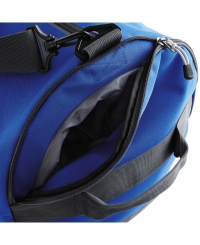 Capacity: 58 litres; TearAway label for ease of rebranding | Water resistant fabric, external mesh ball pocket, shoe tunnel/ wet pocket, authentic metal ventilation eyelets, zippered front valuables pocket, zippered end pocket, external mesh pocket, detachable adjustable shoulder strap with pad, haul handle, padded hand grip