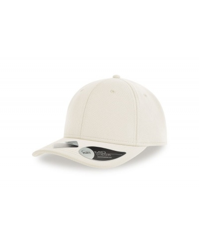 Structured six panel cap made of dope dyed polyester, a certified recycled fabric dyed by hot transfer without immersion in water. Full prostitching, mid visor and 6 eylets. High quality hook&loop closure.