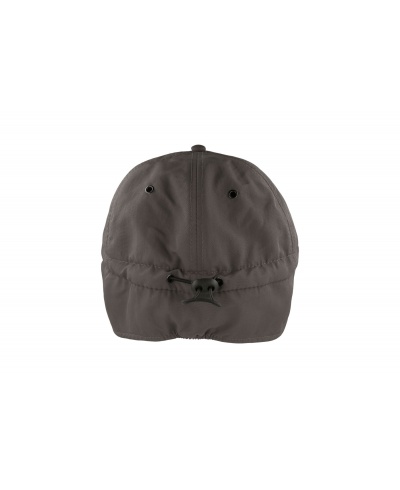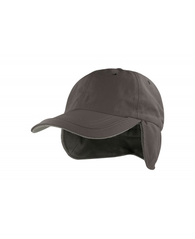 Outdoor winter hat with ear flaps made of recycled nylon. Water-repellent exterior and recycled polar fleece inside. Unstructured front panels and curved visor. Adjustable closure with elastic cords and stopper.