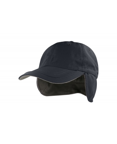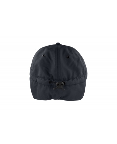 Outdoor winter hat with ear flaps made of recycled nylon. Water-repellent exterior and recycled polar fleece inside. Unstructured front panels and curved visor. Adjustable closure with elastic cords and stopper.