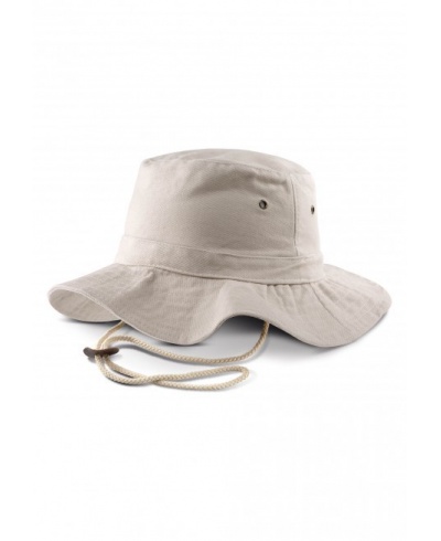 100% Cotton twill. Ventilation eyelets. Size adjuster with leather toggle.