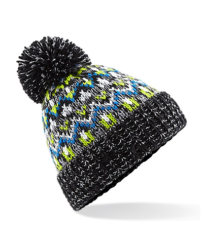 TearAway label for ease of rebranding, cuffed design for optimal decoration, self-coloured pom pom, contemporary geometric pattern