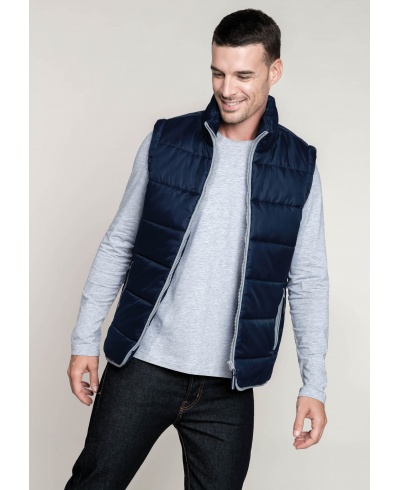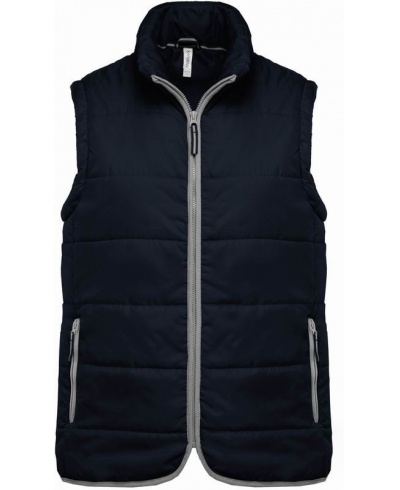 Outer: 100 % polyester ripstop with acrylic coating. Polyester inner padding. Polyester lining 210 T. Comfortable and modern. 2 zipped outer pockets. 1 inner pocket with tear release fastening. Grey contrasting zip and grey contrasting binding at front opening, pockets and hem. 1 zip at chest and 1 zip at hem for decoration access.
