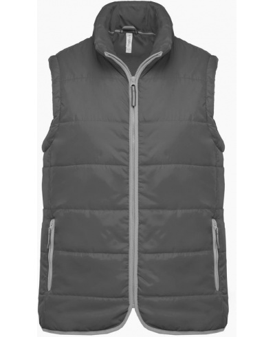 Outer: 100 % polyester ripstop with acrylic coating. Polyester inner padding. Polyester lining 210 T. Comfortable and modern. 2 zipped outer pockets. 1 inner pocket with tear release fastening. Grey contrasting zip and grey contrasting binding at front opening, pockets and hem. 1 zip at chest and 1 zip at hem for decoration access.