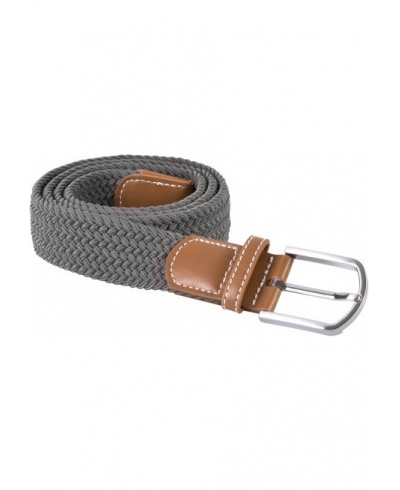 Braided belt with metal buckle. The elasticated composition 52 % rubber 48 % polypropylene, woven and braided, allows air to circulate. Loops finished in polyurethane imitation leather with contrast topstitching. Supplied in cotton pouch.