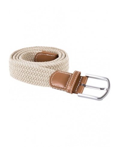 Braided belt with metal buckle. The elasticated composition 52 % rubber 48 % polypropylene, woven and braided, allows air to circulate. Loops finished in polyurethane imitation leather with contrast topstitching. Supplied in cotton pouch.