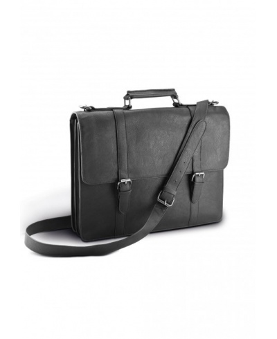 Business bag with detachable 13" laptop / document compartment in PU imitation leather. Detachable shoulder strap, top handle, front flap with 2 buckles, inner zip pocket, metal zip closure.