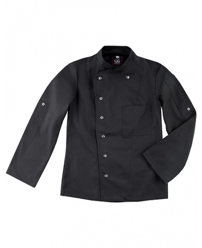 Trendy chef’s jacket, for ladies gently tailored, with practical press buttons, breast pocket and sleeve pocket. The sleeves can be rolled up and secured with a loop and a press button. Vent in the back for mobility. 95° C washable, crease-resistant, easy-care, colourfast, industrial laundering, finishing allowed.