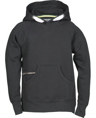 Children’s/boy’s hoodie, hood with double stitched seams, white drawstring with matching stitching closed with double metal rings, raglan sleeves, decorative V-stitching at the neck, small kangaroo pocket, stretch rib cuffs and hem, reinforced seams