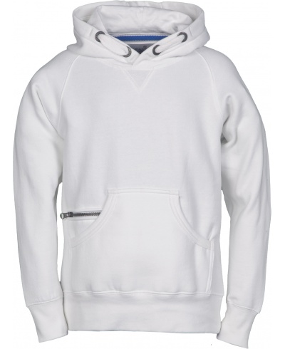Children’s/boy’s hoodie, hood with double stitched seams, white drawstring with matching stitching closed with double metal rings, raglan sleeves, decorative V-stitching at the neck, small kangaroo pocket, stretch rib cuffs and hem, reinforced seams