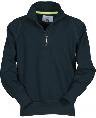 Children’s sweatshirt, with matching half zip in plastic with metal pull, raglan sleeves, stretch rib cuffs and hem, reinforced seams
