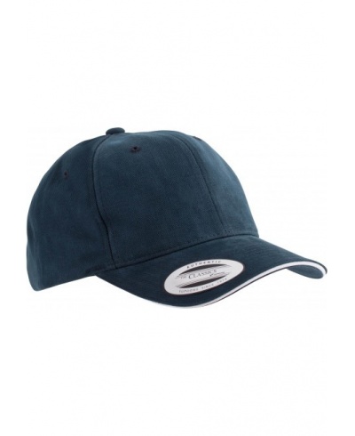 100 % brushed cotton. 6 panels. High-quality classic design. Curved mid-profile peak with contrasting sandwich peak except for Black / Black, Navy / Navy and White / White. Size adjuster with tear release fastening.