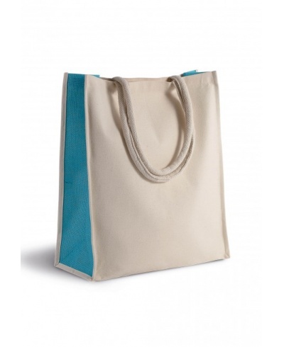 Cotton canvas tote bag 310 gsm with contrasting side yokes in jute canvas 300 gsm. 55 cm ecru cotton handles. Capacity: 23 L.