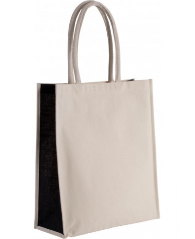 Cotton canvas tote bag 310 gsm with contrasting side yokes in jute canvas 300 gsm. 55 cm ecru cotton handles. Capacity: 23 L.