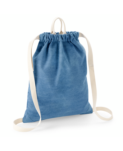 Material: 100% Soft Cotton Denim; Dimensions: 46 x 37 cm; Capacity: 12 litres; TearAway label for ease of rebranding, dual-purpose grab handle/ hanging loops, drawcord closure, cotton webbing shoulder straps, can be carried by hand or backpack style
