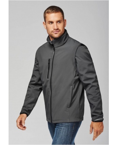 95% polyester / 5% elastane. 3 layers bonded fabric. Breathable up to 3000g/m2/24h and water resistant up to 8000mm. 95% polyester / 5 % elastane outer shell. Breathable mid layer. Microfleece inner layer. Full length front zipper with reflective piping. 2 side zipped pockets and one chest zipped pocket. Detachable sleeves with elasticated cuffs and reflective trims.