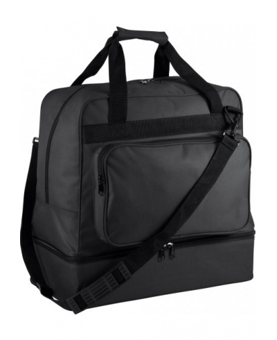 Team sports bag in polyester 600D, double rubber feeling PVC backing, 60 litres. Detachable rigid bottom in PP plastic, with plastic feet. Zipped front pocket ideal for personalization, card holder, detachable shoulder belt with silicon pad. The rigid bottom comes with the bag.
