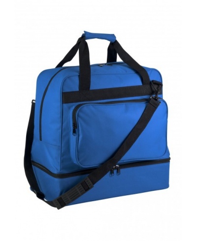 Team sports bag in polyester 600D, double rubber feeling PVC backing, 60 litres. Detachable rigid bottom in PP plastic, with plastic feet. Zipped front pocket ideal for personalization, card holder, detachable shoulder belt with silicon pad. The rigid bottom comes with the bag.