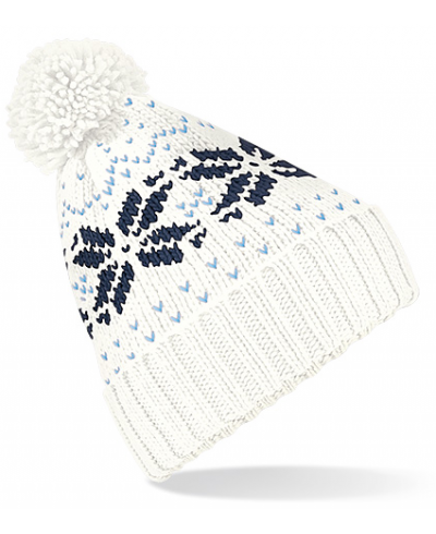 TearAway label for ease of rebranding, classic styling, self-coloured pom pom, cuffed design for optimal decoration, timeless Fair Isle pattern