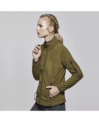 Fleeced jacket for outdoor sports, with high neck and long sleeve ribbed to contrast. Pocket with zip in left sleeve and front zip, both in contrast. Seams in side and chest. Elbow pads in same fabric.