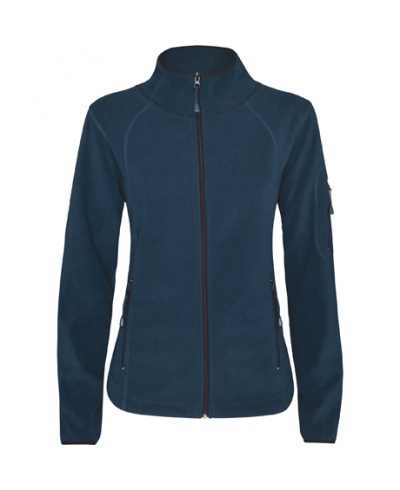 Fleeced jacket for outdoor sports, with high neck and long sleeve ribbed to contrast. Pocket with zip in left sleeve and front zip, both in contrast. Seams in side and chest. Elbow pads in same fabric.