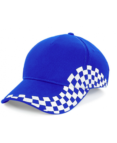 5 panel design, pre-curved peak, stitched ventilation eyelets, perfect for print and embroidery, pre-embroidered chequer design