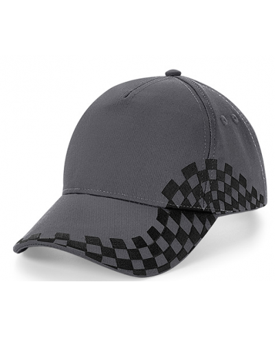 5 panel design, pre-curved peak, stitched ventilation eyelets, perfect for print and embroidery, pre-embroidered chequer design