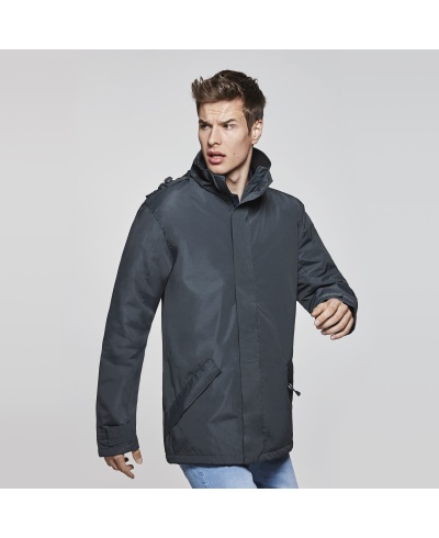 Outer: 100% water resistant polyester, 220 gsm. Inner: 100% quilted polyester. Wadding 110 gsm. Lining 65 gsm. Collar: Fleece. 230 gsm.