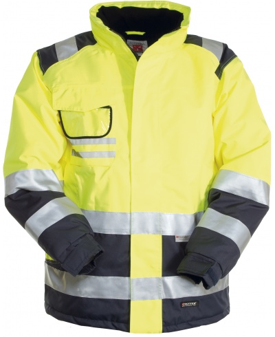 Men’s two-tone, high-visibility jacket with 3M stripes, plastic zip with metal pull with flap and Velcro, elasticated adjustable cuffs, two concealed front pockets, one breast pocket with badge holder. Padded, fleece inside collar, inner pocket, heat taped seams