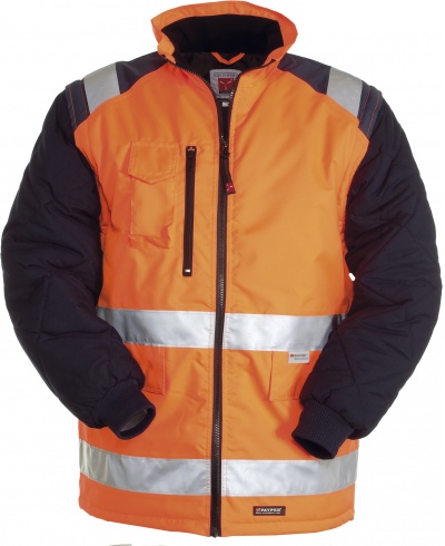 Men’s two-tone, high-visibility lightweight jacket with 3M stripes, detachable sleeves, plastic zip with metal pull, elasticated cuffs, two front pockets, one breast pocket with zip and mobile phone pocket, padded, fleece inside collar, one inner pocket