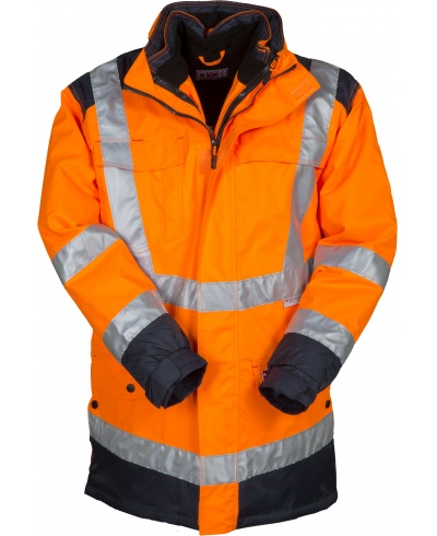 Men’s two-tone, all-purpose, high-visibility parka with 3M stripes. Outer unpadded jacket with plastic zip with metal pull with flap and Velcro, foldaway and/or detachable hood with drawstring, elasticated adjustable cuffs, four roomy front pockets, two with zip, one breast pocket with pen holder and foldaway badge holder and one pocket with concealed zip. Fleece inside collar, zip for easier printing and embroidery. Lightweight jacket with detachable sleeves, padded, plastic zip with metal pull, elasticated cuffs, three front pockets with flap and Velcro, detachable, foldaway badge holder, one pocket with concealed zip, micro-fleece inside collar and shoulders, inner zip for easier printing and embroidery, heat taped seams