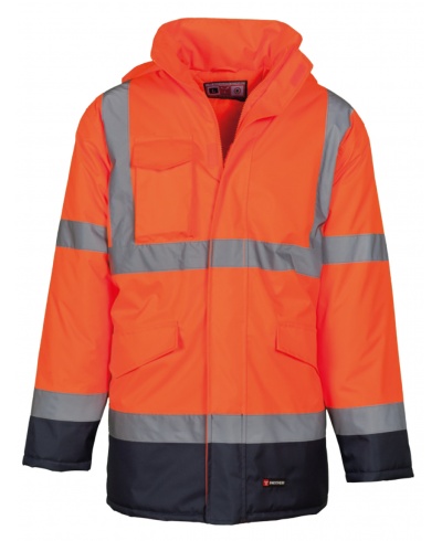 Two-tone high visibility parka with reflective bands, full zip with flap, hood that can be folded into the collar, elasticated RIB cuffs, two front pockets with flap, smartphone pocket and a hook ring for ID holders. Padded inner layer, internal pocket with Velcro, heat-sealed seams