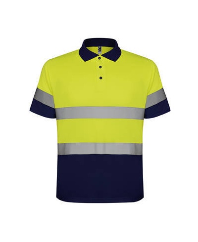 High visibility short sleeve polo shirt with three buttons placket, two reflective bands in body and one on sleeves.
