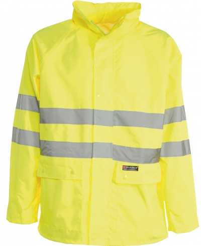 High-visibility, rain jacket with 3M stripes, raglan sleeves, full nylon zip and flap with snap fasteners, foldaway hood, drawstring waist, straight sleeves with elasticated inside cuff, two pockets with flap, heat taped stripes and seams